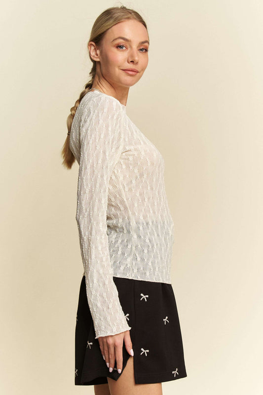 Long Sleeve Sheer Small Embroidered Bows Lace Top