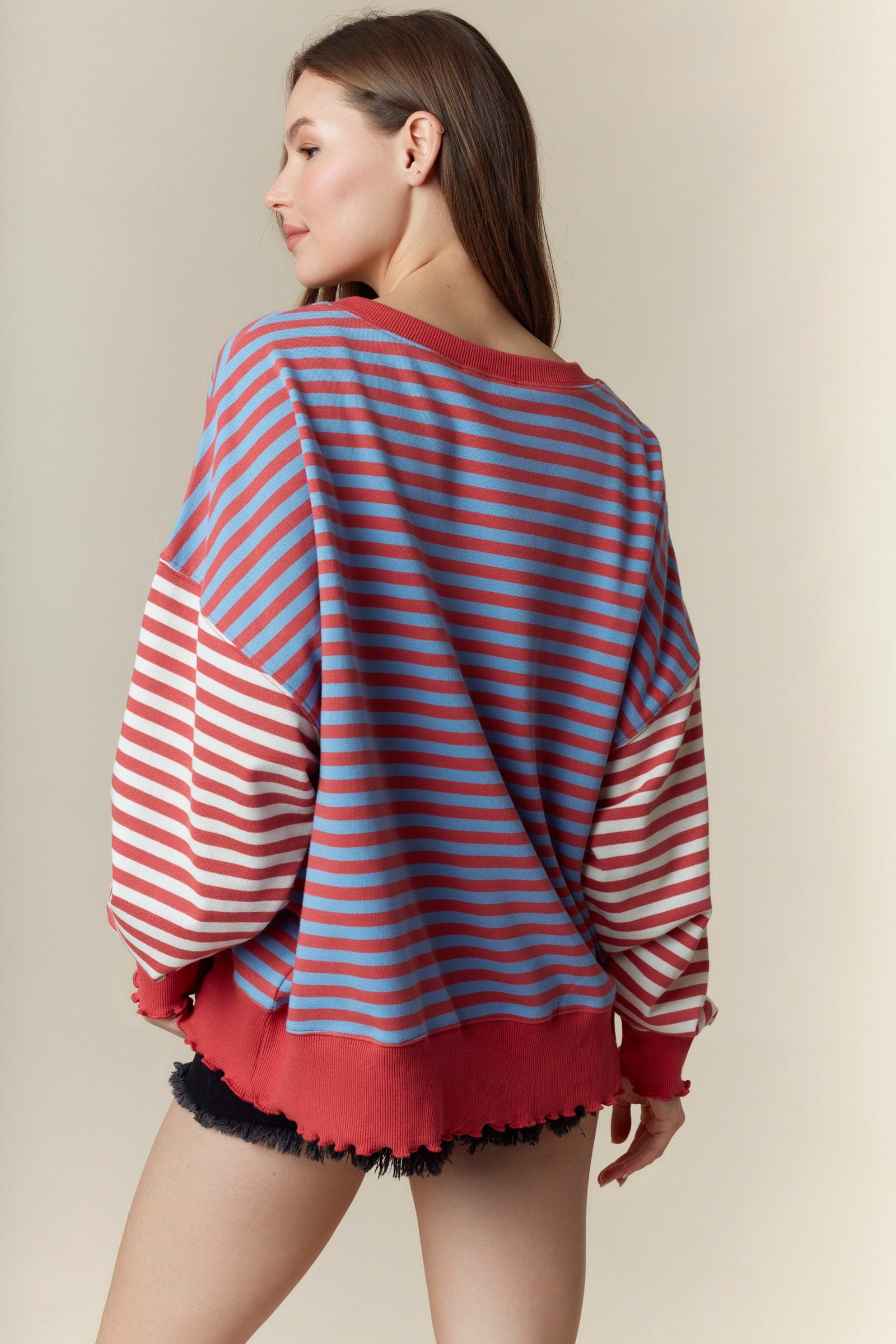 Color Block Striped Lettuce Hem Detail Sweatshirt